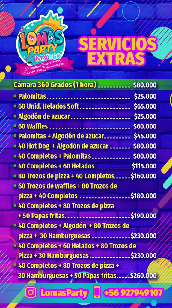 Ofrecemos arriendo de salón para cumpleaños, horarios flexibles y una amplia variedad de servicios extras para fiestas, como palomitas, algodones de azúcar, helados soft, waffles, pizzas, completos, hamburguesas y combos especiales ideales para cualquier evento.