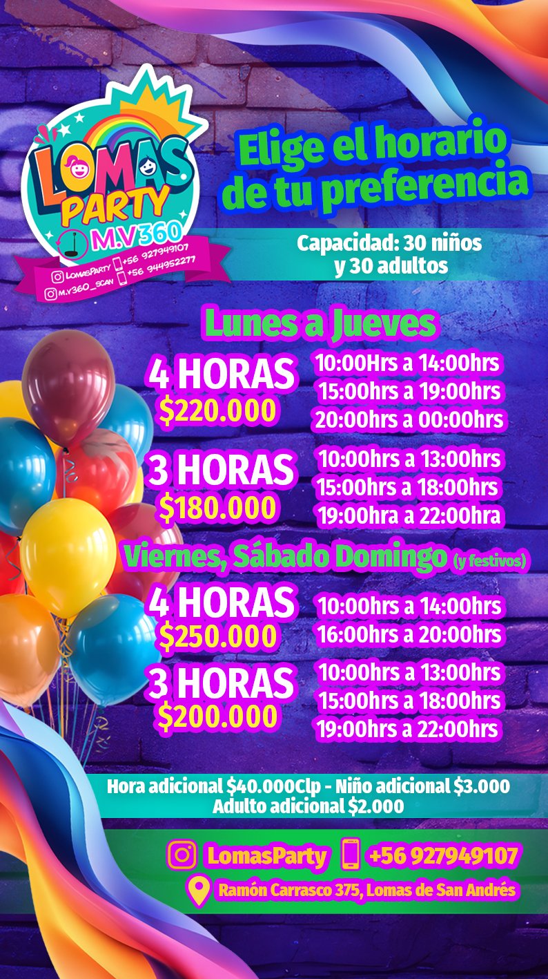 Ubicados en Lomas de San Andrés, Concepción, ofrecemos un lugar completamente equipado para recibir a niños y adultos, con horarios flexibles y servicios adicionales que hacen que cada fiesta sea única. Nuestro objetivo es que las familias disfruten una experiencia completa: un salón cómodo, servicios personalizados y un entorno lleno de color, alegría y energía.